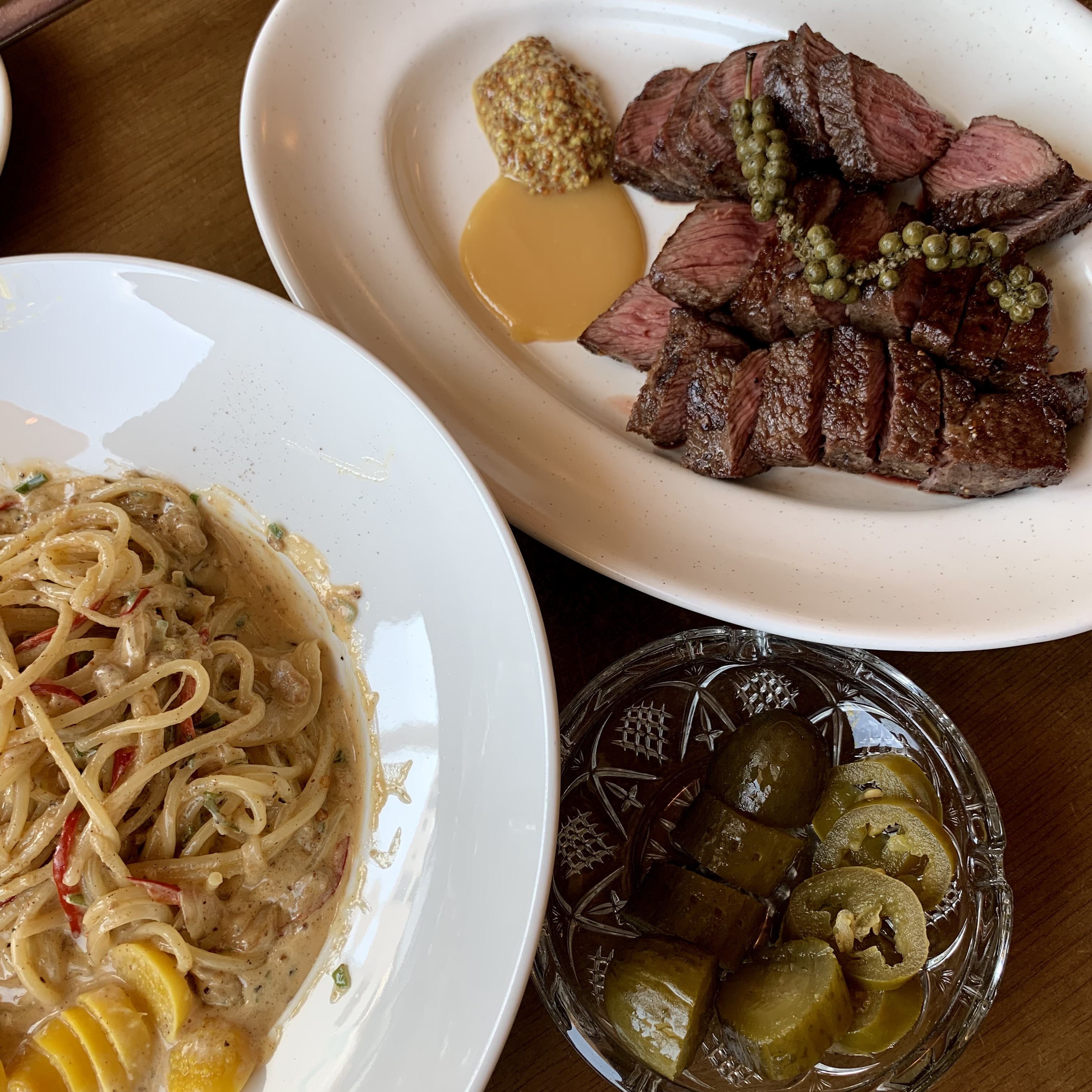 우리는 두 명이서 아귀간크림파스타(19,000원) 하나와 살치살 스테이크(43,000원) 하나를 주문했다.
