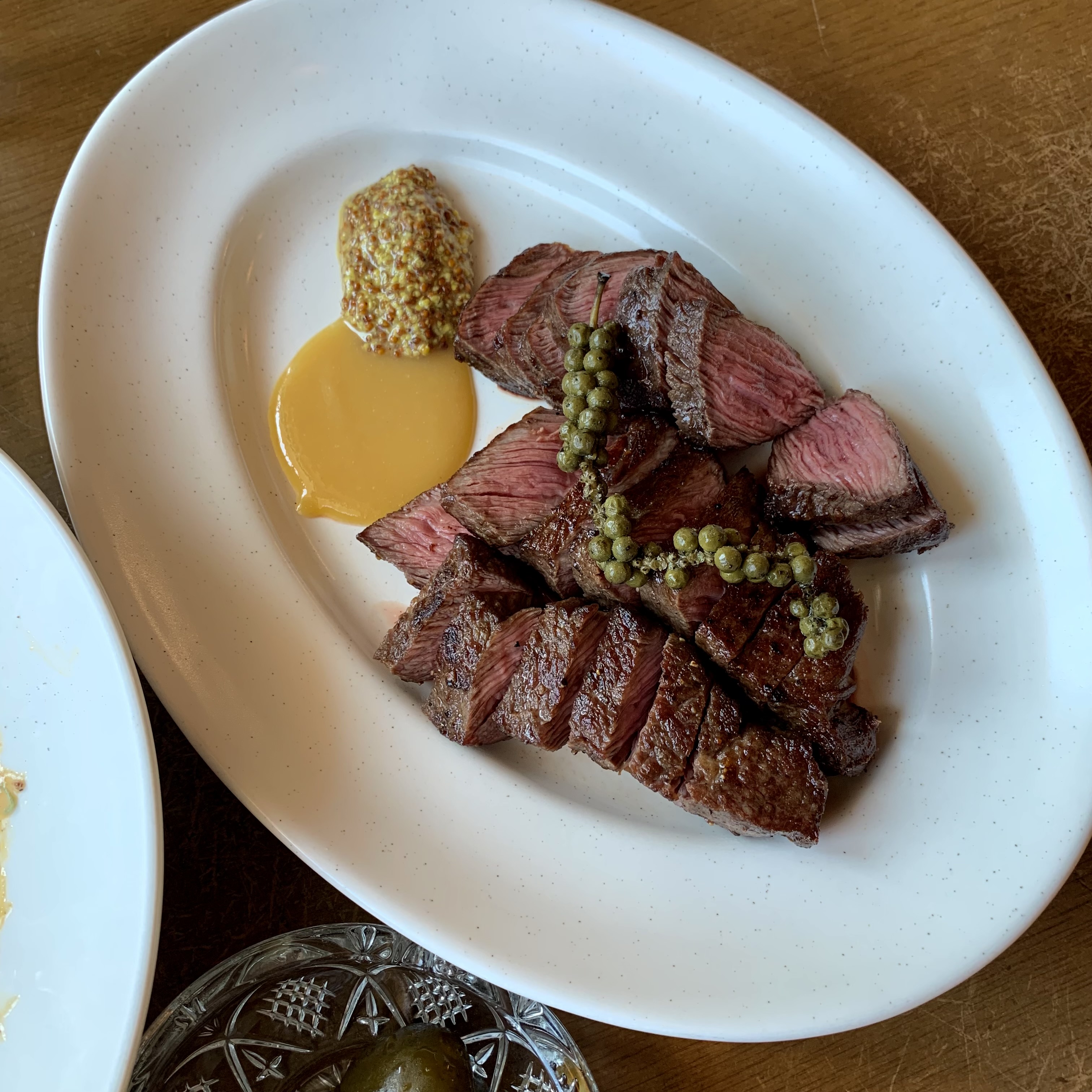 살치살 스테이크와 함께 생후추, 홀그레인머스타드, 노란 소스(어떤 맛이었는지 기억 안 남)가 나왔다.