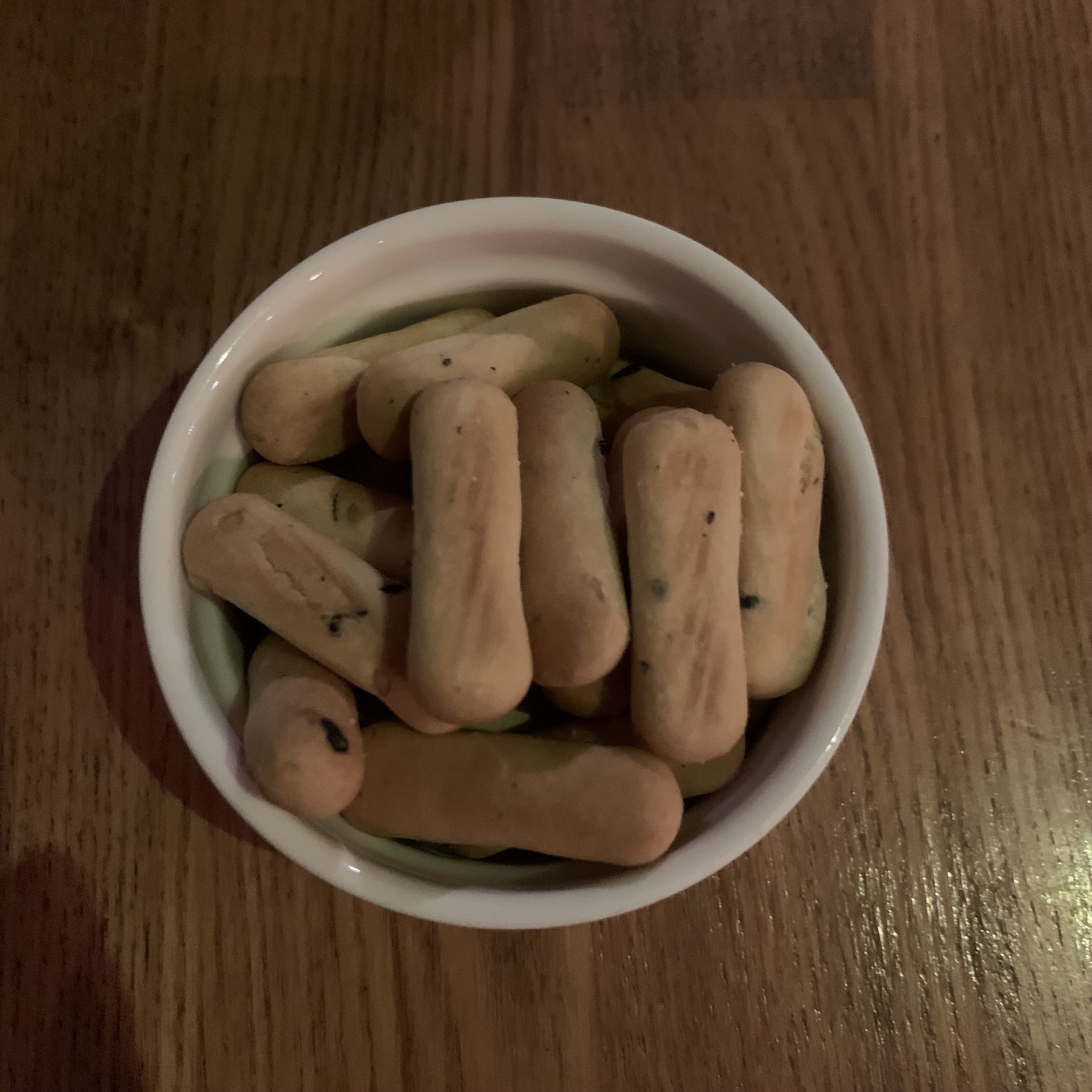 사진과 같은 과자가 기본적으로 제공되었는데 참깨스틱과 유사한 맛이었으며 리필도 가능했었다.